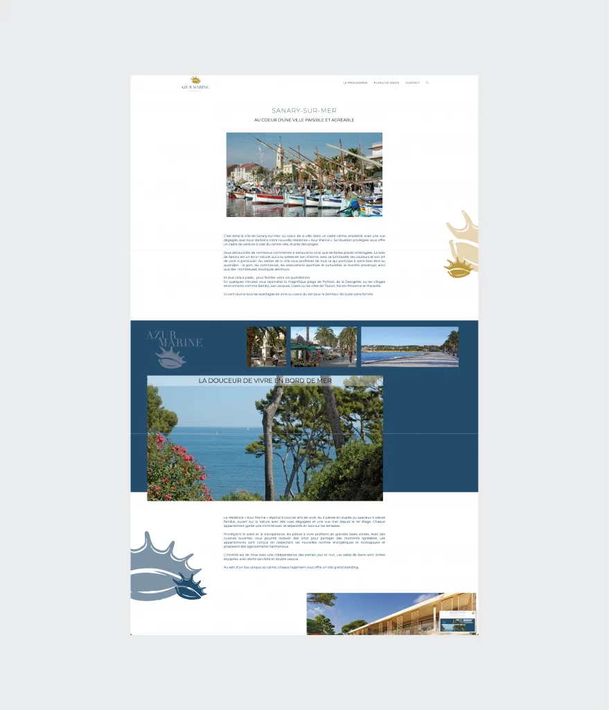 Conception du site Azur Marine, un futur programme immobilier qui se trouve à Sanary-sur-Mer, dans l’une des plus belles baies de la Côte d’Azur. Le site a pour but de mettre en avant les atouts de ce nouveau programme immobilier et de trouver ses futurs acquéreurs.
