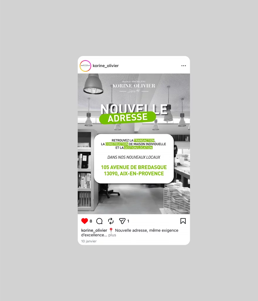 L’objectif de cette collaboration était d’accompagner l’agence dans la valorisation de ses biens sur les réseaux sociaux, mais aussi parfaire leur image de professionnels de l’immobilier. J’ai donc imaginé une nouvelle identité pour les réseaux de l’agence, que ce soit sur des supports fixes ou vidéo.
